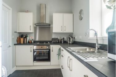 The property, recently renovated to an exceptional standard, features a modern white kitchen, stainless steel oven and hob with anthracite coloured worktop and floor covering.