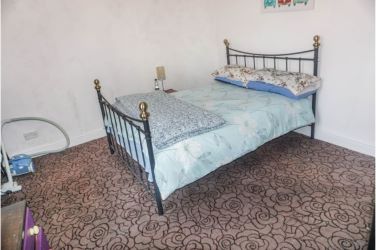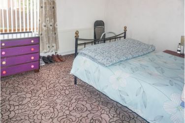 Spacious bedroom, front facing window with blinds, central heating radiator and carpet flooring.