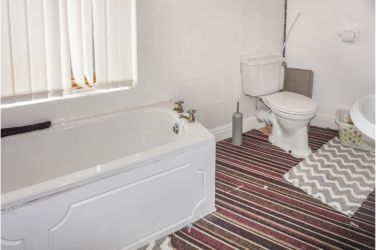 Three piece family bathroom comprising bath, sink and W.C, central heating radiator,window with blinds and carpet flooring.