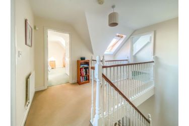 Having a Velux window and fitted with a three-piece bathroom suite comprising of panel bath, WC, pedestal wash basin, part tiled walls, carpeted flooring and radiator.