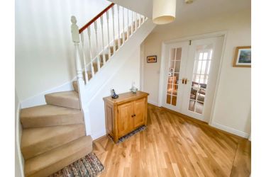 To the front – A brick paved driveway leading to the front entrance and double garage, providing off road parking.