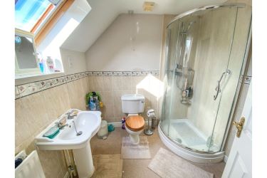En-suite - Comprising a Velux window, carpeted flooring, tiled walls, step in shower, WC, pedestal wash basin, radiator and extractor fan.
