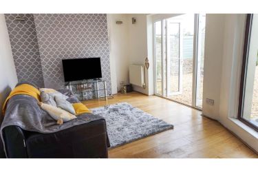 Doors to garden area and window. Fireplace. Laminate flooring, radiator.