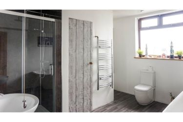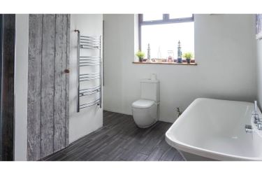 Window to rear. A large white bath, shower cubicle with power shower, WC, heated towel rail, cupboard housing boiler.