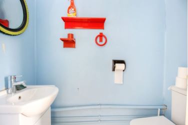 Close coupled wc, wash hand basin with mixer tap and cupboards under, tiled floor.