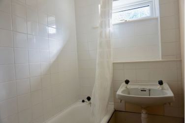 Double glazed obscure window to the side, radiator, airing cupboard, wash hand basin and bath with electric shower over, part tiled walls.