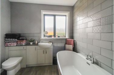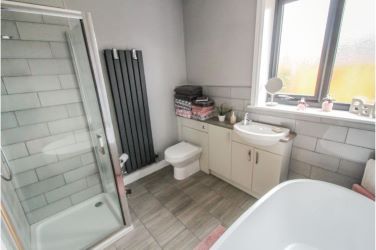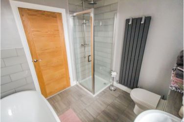 Freestanding bath, low-level W.C, wash hand basin, separate shower cubicle, radiator, inset ceiling spotlights, tiled floor, Upvc double glazed window.