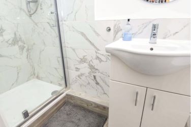 9'10 x 3'0 Half tiled wall ,laminate wood flooring, shower cubical with electric shower, low level w/c, vanity unit with wash hand basin with mixer tap. heated towel rail