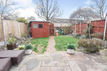 Extensive paved patio, laid to lawn, shed, fenced to sides and rear with rear access gate to: