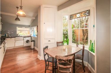 At the back of the ground floor is the stylish kitchen, beautifully decorated in shades of blue; with a lovely dining area in the side bay window, a Belfast sink under the rear window and a door leading out to the back garden.