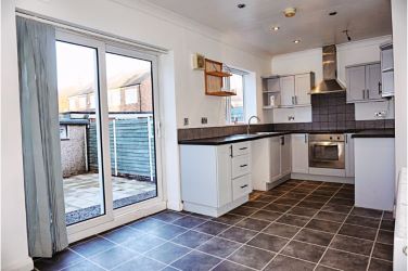 Double glazed sliding doors leading onto the rear garden. Range or wall and base units with stainless steel sink. Electric oven and hob. Space for under counter fridge and freezer. Stainless steel extractor.