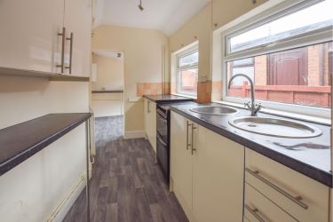 Double glazed door to side elevation, double glazed window to side elevation, marble effect work surfaces having recess below for washing machine, fridge and freezer, wall mounted gas central heating boiler, wood effect vinyl flooring.