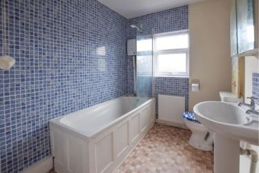 Double glazed window to rear elevation, comprising low level WC, pedestal wash hand basin, panelled bath having electric shower over and glass shower screen, part tiled walls, airing cupboard, tile effect vinyl flooring, radiator.