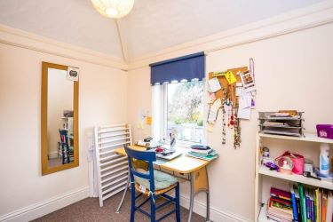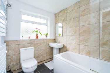 Tiled floor and partially tiled walls. Frosted double glazed window to rear. Bath with shower over. Pedestal hand basin. Low-level W.C.. Heated towel rail. Extractor fan.