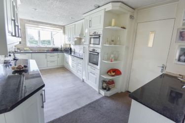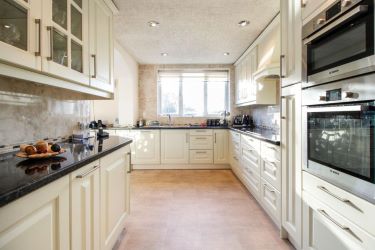 Fitted kitchen with eye and base units incorporating work surface with sink, drainer and mixer taps , integrated double oven, electric hobs with extractor over, led lighting inset to ceiling, vinyl flooring.