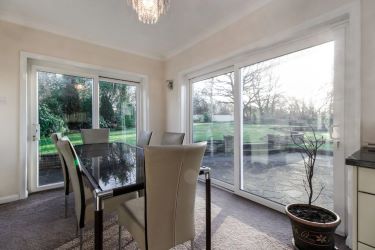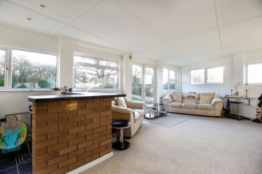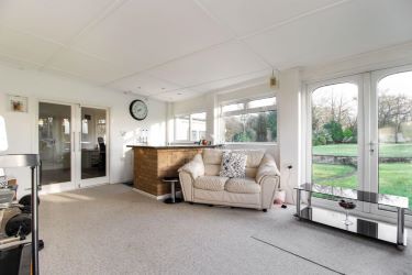 Includes a bar area, surrounding windows with garden and field views, French doors to garden, radiator, fitted carpets.