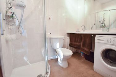 Shower cubicle, wc, wash basin set into vanity unit, radiator.
