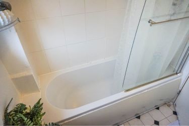 The bathroom comprises; low-level W.C, hand wash basin, white panel bathtub, and a wall-mounted showerhead above.
