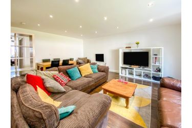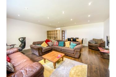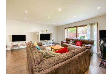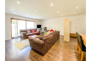 Living Area (5.61m x 6.20m) Large space currently used as a living area and with space for a dining table and chairs. Large sliding patio doors to the rear garden.