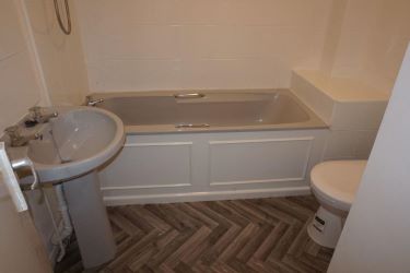 A modern white three piece suite comprising WC, pedestal wash hand basin and panel enclosed bath. Part tiled walls and vinyl flooring.
