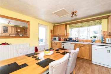 A Fitted kitchen to include a one and a half bowl sink unit, a range of wall and base units, rolled edge worktops, integrated dishwasher and fridge/freezer, radiator, window to the rear, door to the side.