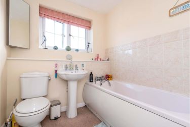White suite comprising a modern panelled bath, low-level Wc, pedestal wash hand basin, heated towel rail, window to the rear.