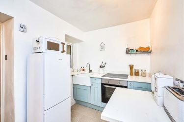 With a range of modern wall and base units with contrasting work tops. Built-in electric oven, electric halogen hob integrated into work surface, and laminate breakfast bar with seating. Belfast ceramic sink with mixer tap, rear aspect uPVC double glazed window looking out over the rear garden and tiled floor. Door leading to first floor.