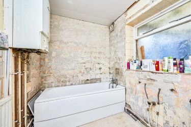 Bathroom with white suite briefly comprising; space and plumbing for a sink WC and bath with mixer tap. Wall-mounted radiator, panelled ceiling, uPVC double glazed frosted glass window. Bathroom also houses the Worcester Combi boiler which is wall mounted.