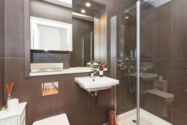 Fully tiled bathroom: electric towel rail, ventilator booster, WC, sink and shower