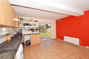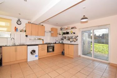 The lounge has wooden flooring throughout and a neutral grey/white colour scheme. There is a feature fireplace that also follows the same colour scheme making it a nice touch to complete the room. At the back of the room is a large sliding door that leads you out to the garden's patio area. On the other side of the property, the kitchen has a fully tiled floor along with a tiled splashback behind all the countertops. The units are fitted with a built-in oven, gas hob and extractor fan, along with spaces for a washing machine, tumble dryer and dishwasher. Also accessible is an under the stairs storage area which is ideal for a pantry. To the back is another sliding door also lead out to the garden's patio area.