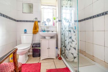 Bathroom 3 piece suite, low level wc, step in shower, pedestal wash basin, tiled floor, double glazed window, radiator