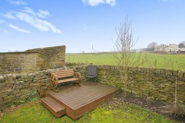 The garden has a patio, steps lead to a lawn and a decked terrace, perfect for relaxing.
