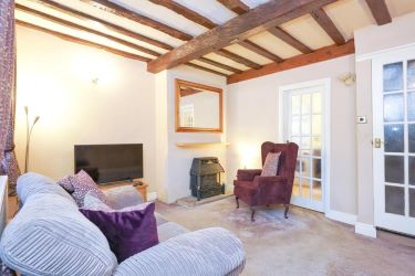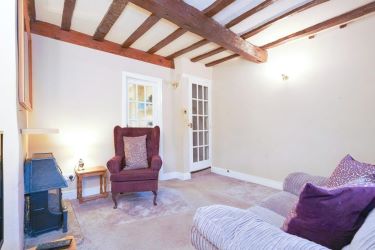 A door to the front opens to the lounge with exposed beams and stone mullion style windows to the front. The lounge also features a gas fire.