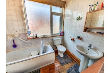 Double glazed UPVC frosted window to side. Panelled bath tub with shower over. Pedestal hand basin. Low level W.C. Fully tiled walls. Radiator & wooden flooring.