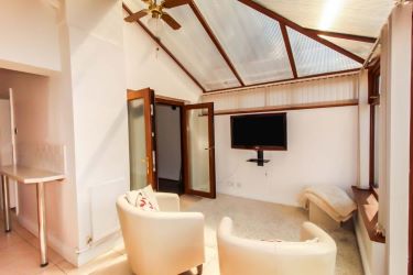 Located off the kitchen and dining room, this lovely light conservatory, decorated in neutral tones, looks out over the decking and lawn of the back garden, and is ideal for relaxing.