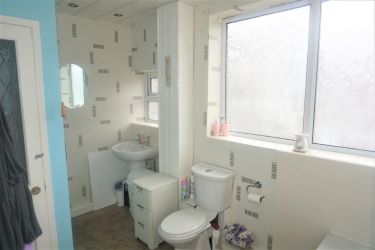 Extended bathroom comprising; Panelled bath with shower over, low level w.c, pedestal hand wash basin, central heating radiator, two double glazed windows and storage cupboard.