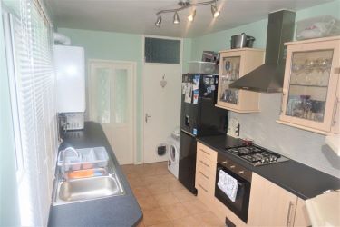Fitted wall and base units with work top surfaces, stainless steel sink unit with mixer tap, ceramic wall and floor tiles, electric oven and hob with extractor canopy, plumbing for an automatic washing machine, central heating radiator and double glazed window.