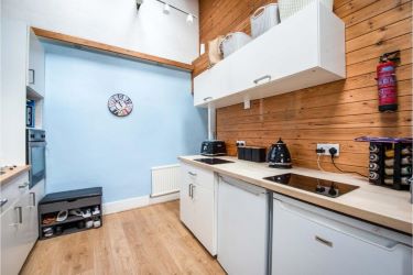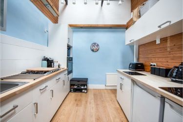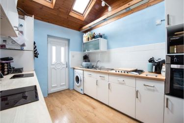 Vaulted ceiling with sky light windows. Fitted sink with mixer tap, oven and hob. Free standing washing machine, fridge and freezer. Radiator.