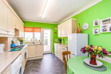 12'6 x 9'2 fitted with a matching range of wall mounted and base units with drawers and a work top with inset single drainer sink with mixer taps. Built in cooker with four ring hob with extractor hood over. Plumbing for a washing machine, appliance space. Space for table and chairs, rear entrance door.