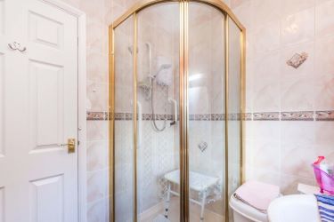 6'1 x 5'4 Shower cubicle, wash basin and WC. Tiled walls and floor.