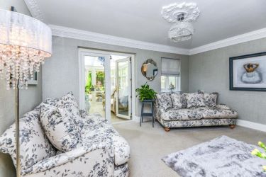 Modern newly finished featured décor, garden view window. French doors to the conservatory, grey carpets, ceiling rose with featured cornice, beautiful remote control cast iron fire place and featured crystal pendant lighting.