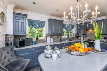 Beautifully designed bespoke hand painted shaker style fitted kitchen, marble styled worktops, downlighters, sink/drainer, central island with 4 x bar stools, oven, gas hob, extractor fan, tiled featured splash backs, oven, 4 ring gas hob, extractor fan, integrated, wine cooler, wine rack, washing machine, dryer and freestanding American style fridge freezer included with the sale. Featured chandelier pendant lighting, triple aspect windows, entry doorway, under-stair seating area, featured décor, tiled ash wood style flooring with underfloor heating.