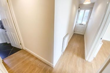 Entrance door, wood effect flooring, radiator, door to: