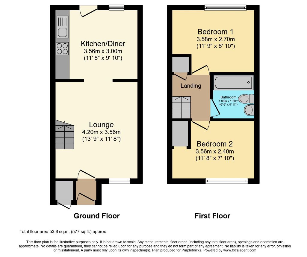 Downstairs compromises of open plan kitchen leading into the living room. Upstairs has 2 spaciously sized bedrooms complete with a bathroom. Total modernisation needed throughout.