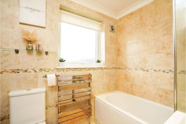 Bath with shower over. Hand basin with drawers under. Low-level W.C.. Tiled floor and walls. Under floor heating. Heated towel rail. Coving. Extractor fan.