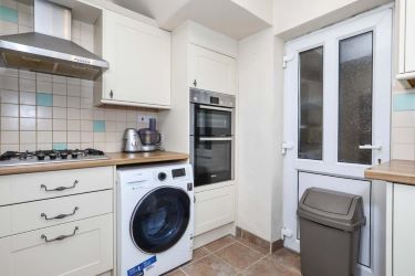 The kitchen is fitted with a range of base and eye level units with worktops over, sink unit, fridge freezer, dishwasher, double oven and hob. There is a door that leads out to the side of the property.