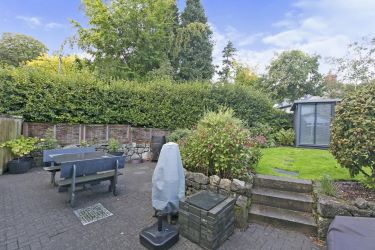 A beautiful cottage style garden with a wealth of mature trees, shrubs, flower beds and vegetable plot. Stone steps to raised lawn area, paved patio area with timber surround, timber gate to front pedestrian access, timber storage shed, wood framed green house, home office