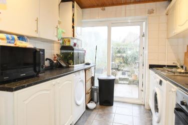 Comprehensive range of base and wall units, rolled work top housing one and a half sink unit and single side drainer, mixer tap, tiled floor, built in oven and hob, space for washing machine, space for fridge/freezer, complementary tiling, wall mounted gas central heating boiler, inset ceiling lights, double glazed double opening doors leading to rear garden.