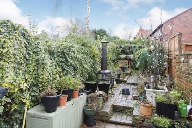 Paved rear garden, hedge to side and rear elevation, part wall to side elevation, raised flower/shrub borders.