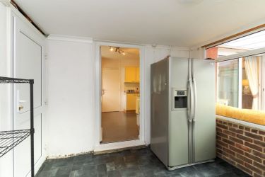 Kitchen with a range of wall and base units, space for appliances, door to the garden room, garden room with store cupboard and downstairs W.C.
